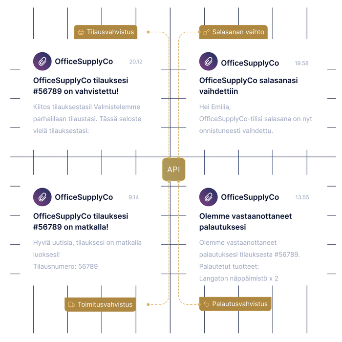 MyLINK Email API on optimoitu tapahtumapohjaisia viestitystilanteita varten. Lähetä tilausvahvistukset, turvallisuushälytykset ja ilmoitukset automaattisesti ja oikea-aikaisesti.