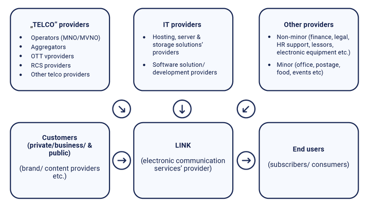 LINK recognizes itself as a part of the global electronic communication value chain. LINK’s services enable sending, receiving and/or circulating any electronic message between LINK’s customer and an end-user, either via telecom networks and OTT channels, or via an access to LINK’s platforms and other software solutions. When rendering our services, we rely on electronic communication sector providers (“telco” providers), IT providers and a variety of other entities.