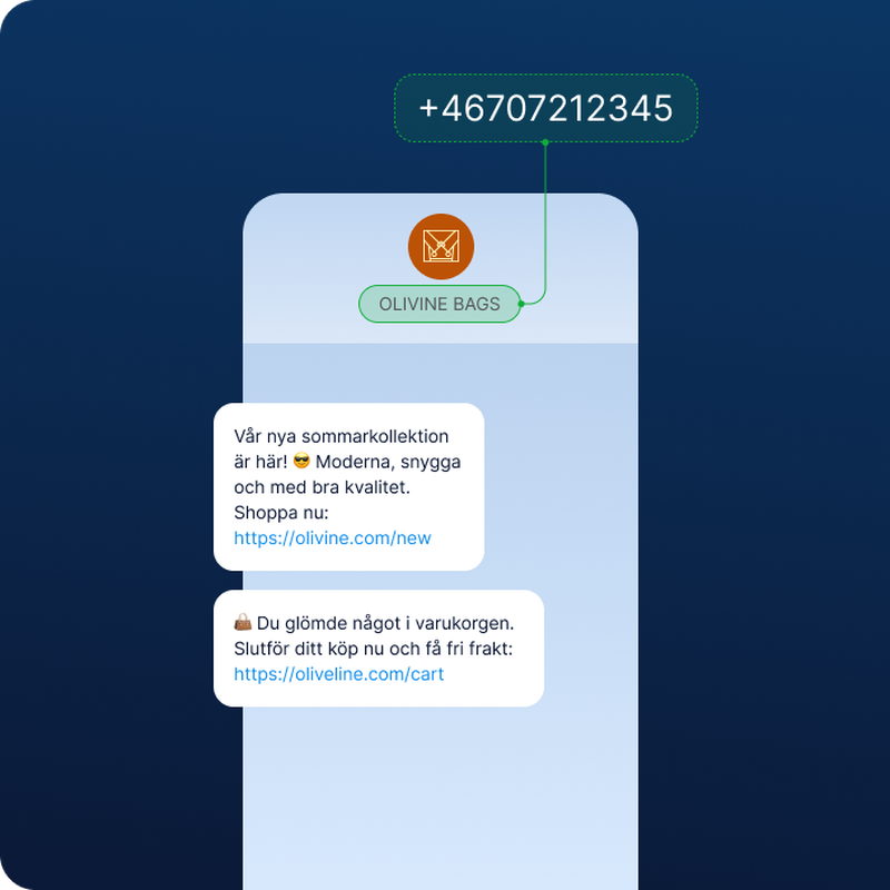 Hjälp dina kunder att enkelt känna igen dina SMS-utskick med ett alfanumeriskt avsändar-ID (upp till 11 tecken). Addera ytterligare skydd och trygghet för kunder genom att verifiera dig med hjälp av ett avsändarskydd som hindrar andra att skicka SMS i ditt namn.