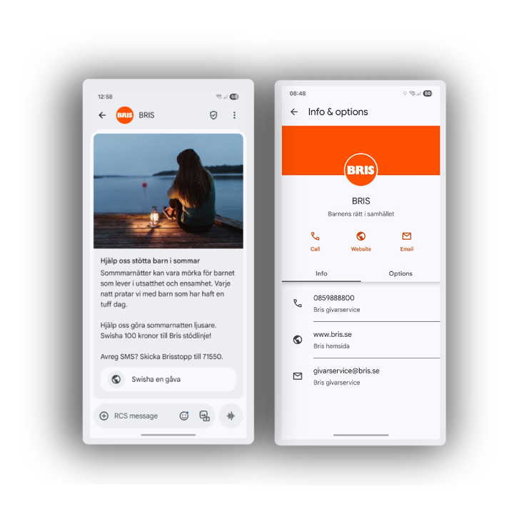 En av fördelarna med RCS är dess interaktiva och visuella funktionalitet. Bris byggde upp sina kampanjer med text, bild och en tydlig CTA-knapp som ledde direkt till en gåvosida. För de mottagare som inte kunde ta emot RCS-meddelandet användes SMS som fallback, vilket gjorde att organisationen fortfarande kunde nå hela urvalet.